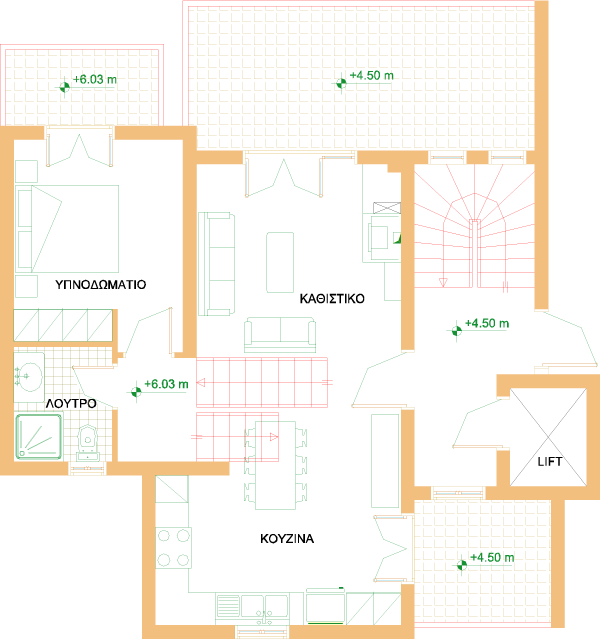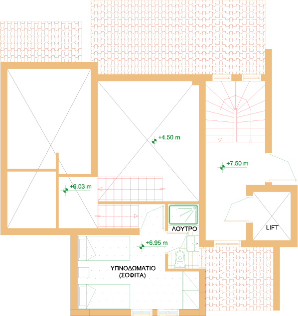 It is developed on three split levels on the second and third floors of the complex.